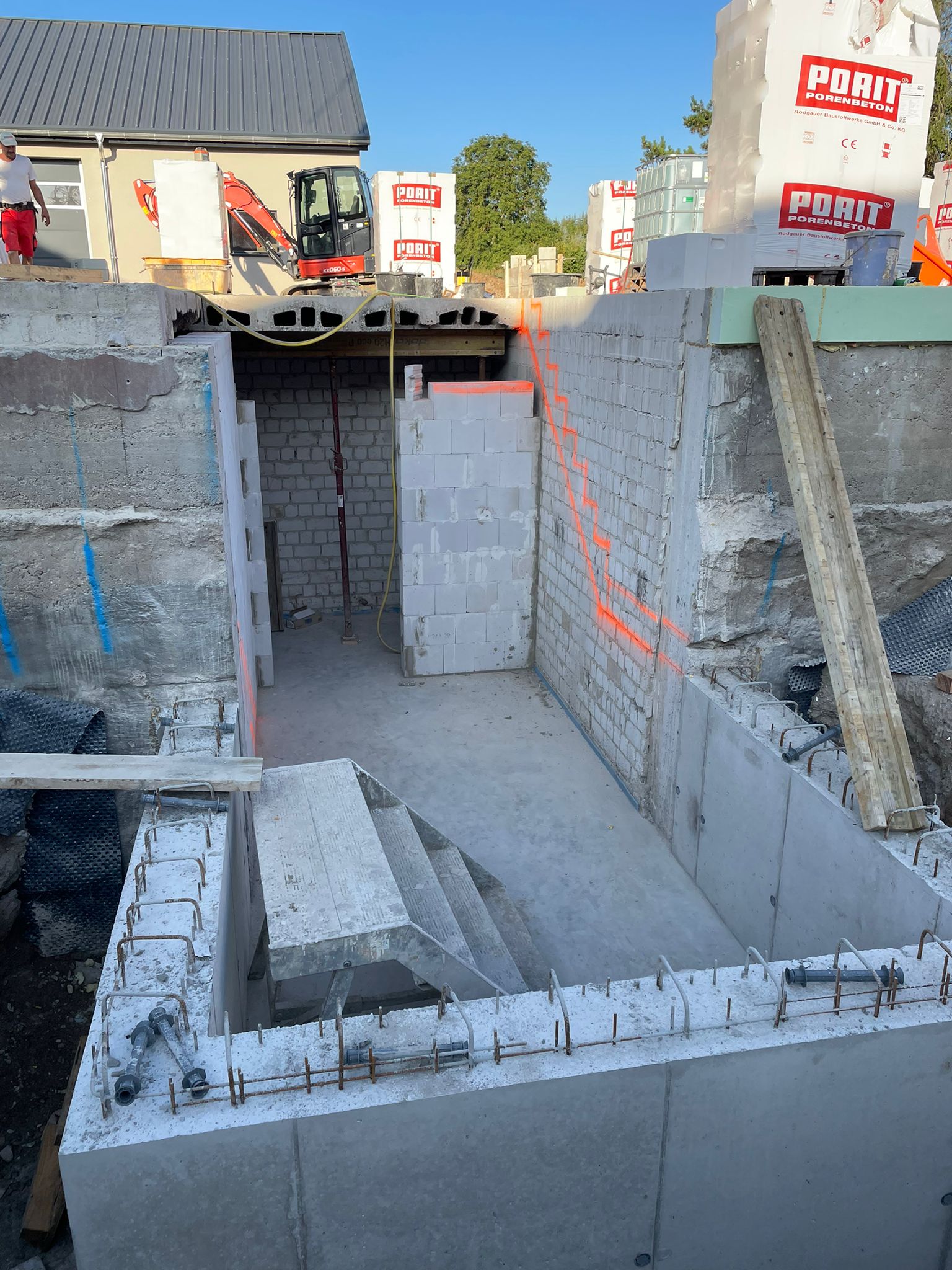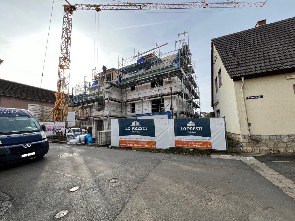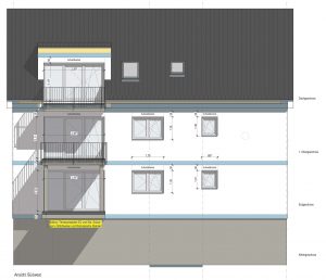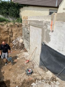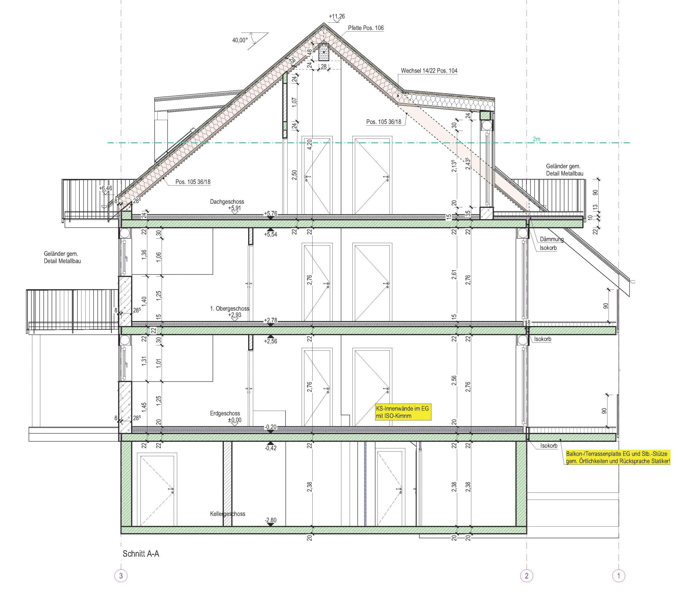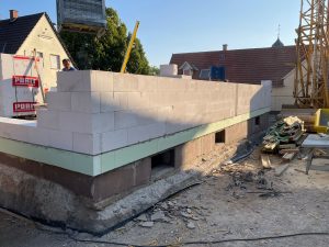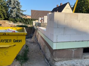 Nach statischer Prüfung wurde das Bestandshaus abgerissen. Der massiv gemauerte Keller wurde erhalten. Der darauf erstellte Neubau wird nach KfW Effizienzhaus 55 Standard errichtet.